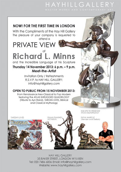 The Weight of the World This November, Hay Hill Gallery proudly presents a collection of sculpture by the renowned artist Richard Minns. His dynamic creations feature figures from biblical narrative and Greek myth, stories of shining heroes and crippling power struggles. The opposition between man and the gods, men and women, mortality and immortality are recurring themes described by these hauntingly beautiful works. Anchored to the material world, many of Minns’ heroes are flawed and ultimately bound by gravity. Mainly nude or semi-clad, these muscular subjects remind the viewer simultaneously of vulnerability and power. The Atlas Shrugged series interprets Ayn Rand’s central message of individualism and objective thought; that the most depraved human being is ‘the man without purpose’, that identity comes only from how successful we are with what we’ve been given. The sculptures embody a sense of earthy determination, bodies the colour of blood and sweat beneath the looming silvery globes. In another scenario Atlas battles against his fate, pinned between earth and sky, limbs raging through the very skin of the sea. Minns himself has proved to be the irrepressible master of reinvention, continuously journeying from one successful venture to another. Legendary as a boxing champion and a rodeo competitor, famous as a multi-millionaire tycoon, he is as tall in reality as the tales appear. With a retirement that lasted all of one week, Minns went on to wrestle two great white sharks, take a wild spin on the back of a 16ft wide giant ray, and now in his fourteenth career he has become a much respected artist in a cynical world. In Creation of Adam III, the first man is held in God’s outstretched hand, reminding us that we too are made in that image, though in a cruel twist we are mortal. Man is both the created and the creator, formed of clay yet sculpting the hand of God in human likeness. Eve is drawn from Adam’s side and becomes his downfall in the desire for earthly rather than godly things. This original struggle between men and women is presented in several of Minns’ works, particularly regarding the danger of beauty. Pygmalion Creates Galatea depicts a man fallen in hopeless love with a lifeless sculpture; Diana Punishes Actaeon shows the hunter ensnared like a stag by the goddess resulting in his death at the teeth of his own hounds. Minns questions the invincibility of a proud man or seductive woman with the inevitability of illness, old age- and ultimately death. Having made his fortune through the world’s first publicly-listed network of Health and Fitness Spas, this world-class artist is surely a force to be reckoned with, pushing beyond ordinary boundaries of strength and mental agility. His fascination with the human anatomy is clearly communicated through each striking work at Hay Hill Gallery; and where he once dictated exact specifications for his own honed muscles, he now fluently renders the perfectly sleek forms of golden heroes and demi-gods. Tarzan Lives! might be a self-portrait, ‘stripping off the thin veneer of civilisation’. The artist tests his own personal speed and agility, challenging nature by setting physical endurance world records for every birthday. Every year for Minns is more extraordinary than the last, fighting dangerous creatures or terminal illness he reinforces his own mythology. Meticulously detailed, these bronze figures are the soulful mouthpiece of his philosophy, drawing out living tensions between flesh and spirit. Richard Minns’ sculptures embody his own inner feelings and capture his soul. When he won the battle against cancer, he created Against Goliath, a triumphant David standing over the beheaded giant. This hero stands like a proud matador, his posture a symbol of victory, holding Goliath’s huge sword behind him in his right hand, with his left hand dramatically outstretched. Here we see true brightness in the metal, a spirited masterwork catching glints of light, sparks flickering within the dark patina. Breathing fire into every one of his creations, Minns imbues them with energy from his own inexhaustible source. |